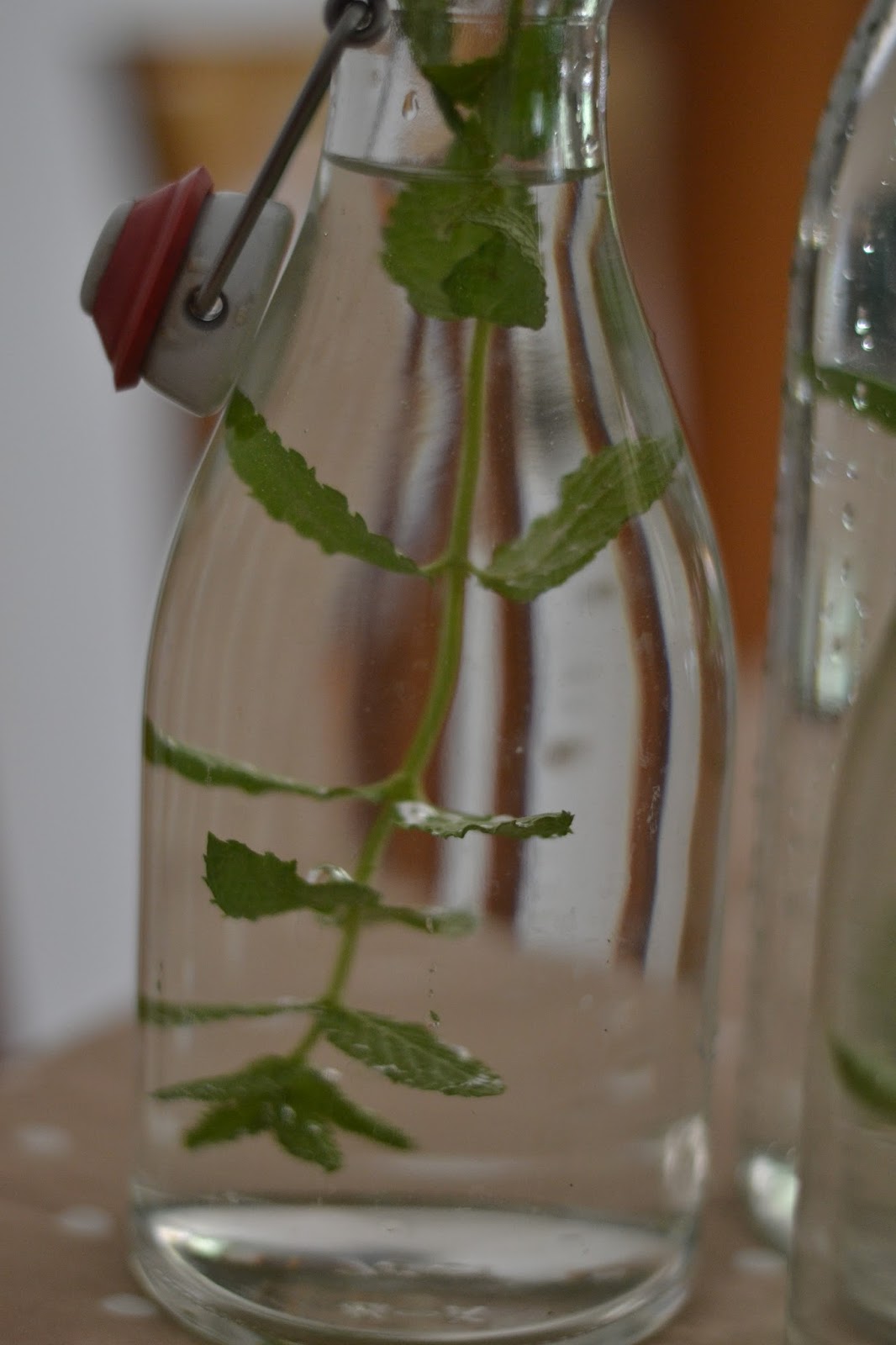 Je teste donc d'autres choses. Et voilà le petit truc le plus simple est le plus rafraîchissant que j'aie trouvé jusque là : une brin de menthe. J'ai planté ce printemps de la menthe marocaine, mais, je fais des thés à la menthe une fois tous les 100 ans, c'est définitivement trop sucré pour moi. A la recherche d'une idée pour l'écouler, j'ai trouvé plusieurs boissons à base de menthe, mais là encore toutes sucrées. Comme vous l'avez déjà compris, j'aime pas qu'on mette du sucre dans ce que je bois. J'ai donc déposé dans mes bouteilles d'eau une simple tige de menthe et je l'ai abandonné là quelques heures.